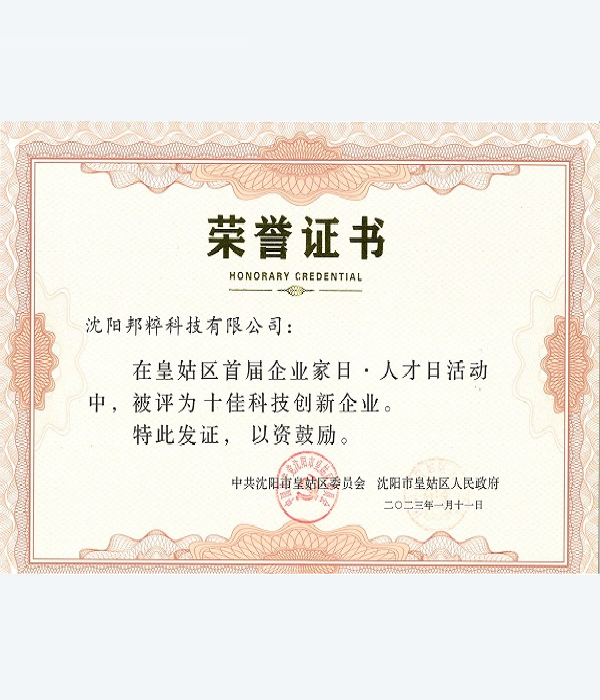 沈陽市皇姑區(qū)十佳科技創(chuàng)新企業(yè)