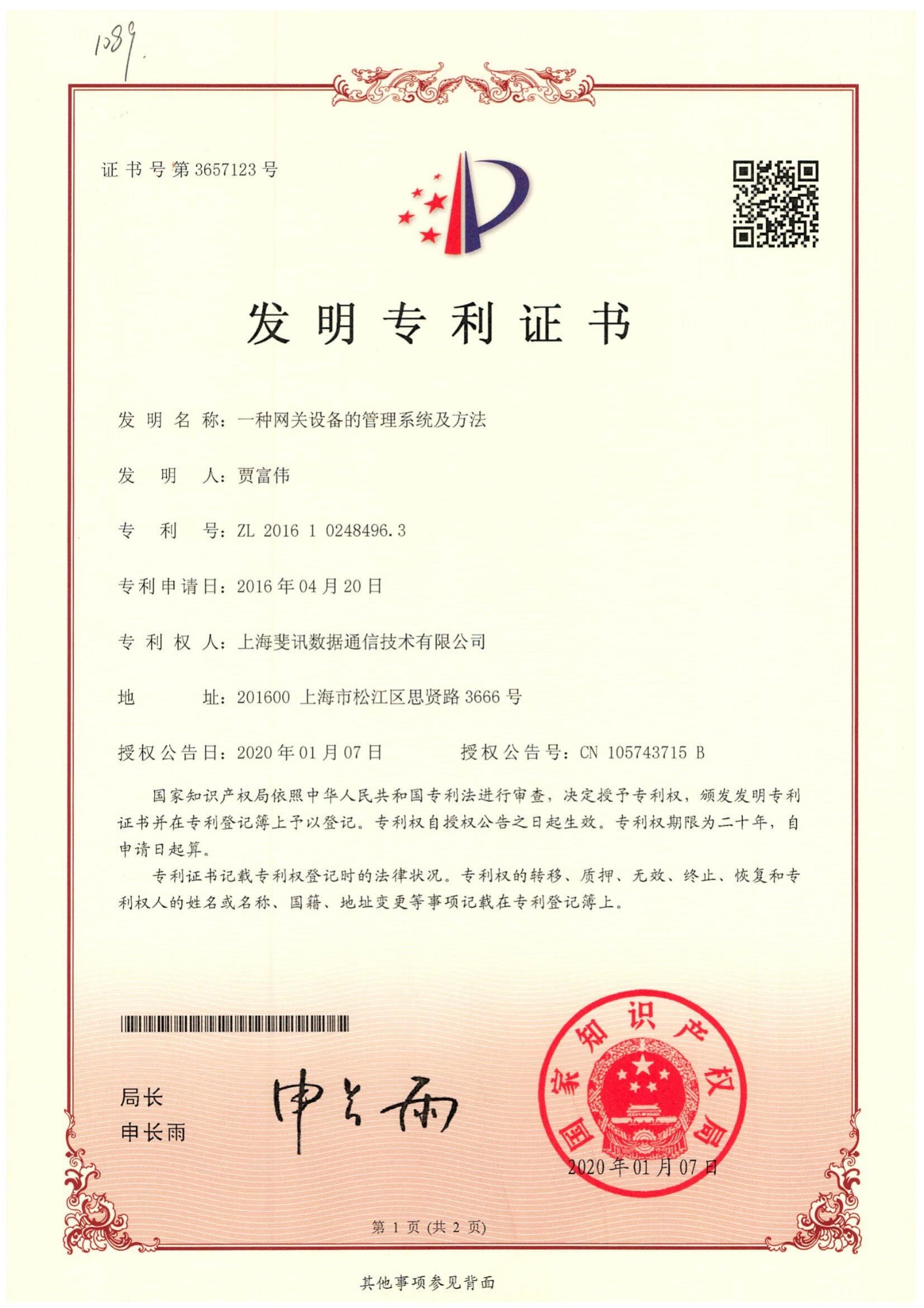 一種網(wǎng)關(guān)設(shè)備的管理系統(tǒng)及方法專利證書
